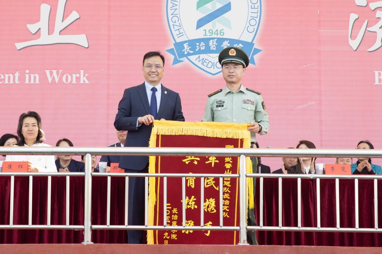 王金胜代表学校向武警山西总队长治支队赠送锦旗,表达对承训单位辛勤付出的衷心感谢。