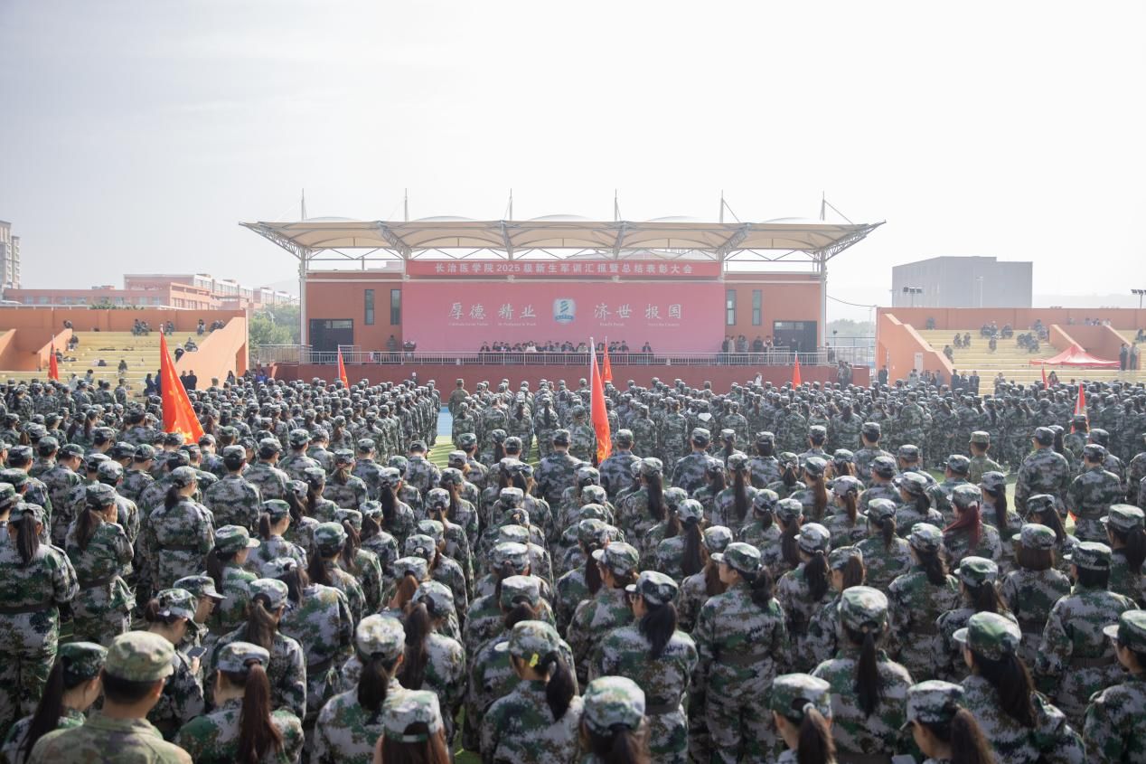 随后,2025级新生以连队为单位进行了分列式汇报表演。22个连队步伐整齐、口号嘹亮、精神饱满,展现出良好的军事素养和昂扬斗志。紧接着,学生方队依次进行了擒敌拳、匕首操表演,动作刚劲有力、连贯娴熟;退役大学生教官进行了队列动作示范表演,展现出过硬的军事作风;教官与学生联合开展的战地救援演练,模拟实战环境,流程专业有序,体现了我校医学特色与军事训练的深度融合。