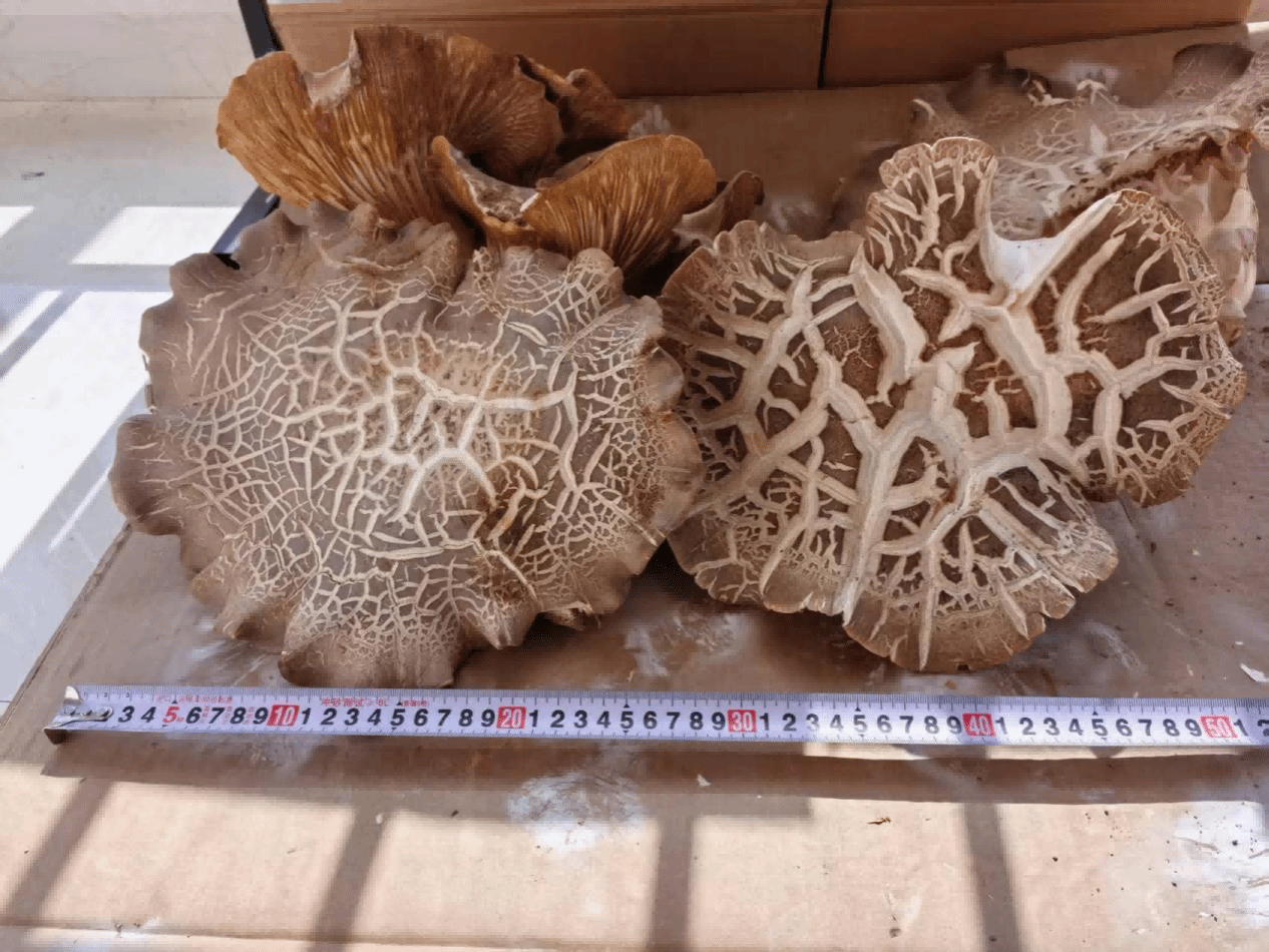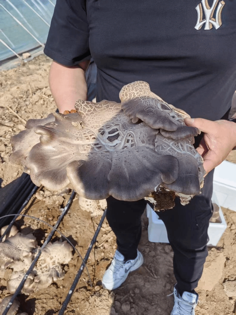 “粮—菇”轮作模式作为段国锋的博士科研启动资金项目,以多项原创技术破解了农业生产的现实难题。其技术核心在于:秋季玉米、谷子等作物收获后,直接在大田种植低温巨型菇菌棒,除布设灌溉设备外,无需新增其他设施,春节前即可收获1—2茬鲜菇;经简易覆盖越冬后,次年4月中旬前还可再收获1—2茬。该菇种口感细腻、自带清香,且个体硕大,单株最重可达2.5公斤,亩产鲜菇最高达20000斤。此外,该模式支持大棚套种,进一步提升了土地利用效率。收获结束后,菌棒由旋耕机打碎还田,转化为优质有机肥,开启新一轮粮食种植循环,真正实现了“变废为宝”与“用地养地”相结合。