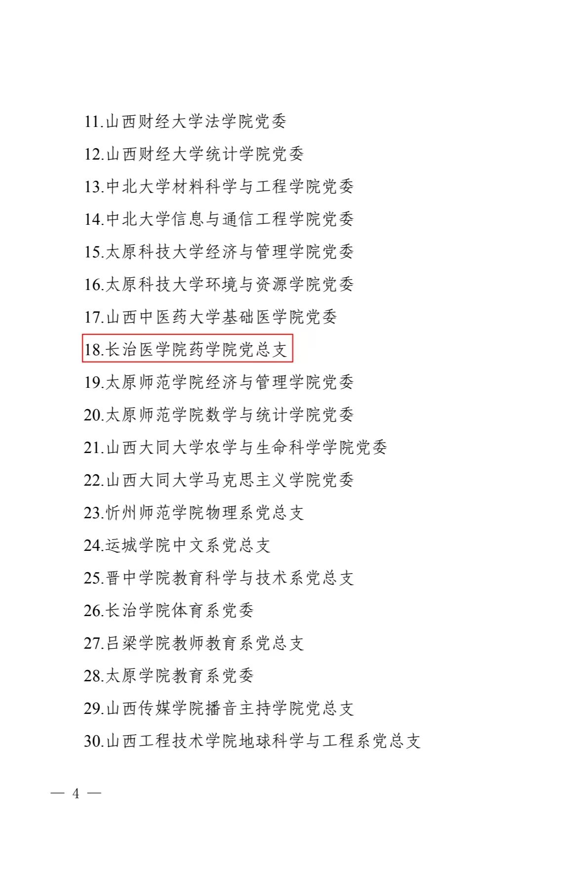 近日,山西省委教育工委公布第二批全省高校“育人先锋”党建品牌项目,我校5个党建项目入选。其中,药学院党总支入选全省高校党建工作标杆院系创建单位,药学院上党中药材党支部、护理学院教工党支部、第一临床学院学生第二党支部入选全省高校党建工作样板支部创建单位,马克思主义学院教工第一党支部入选全省高校“双带头人”教师党支部书记工作室创建单位。