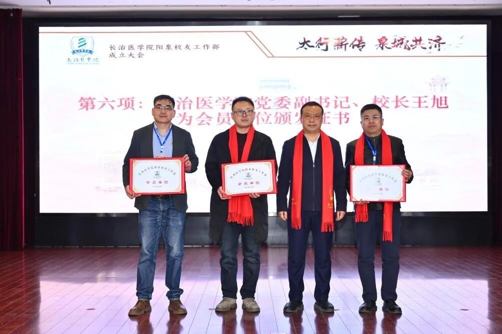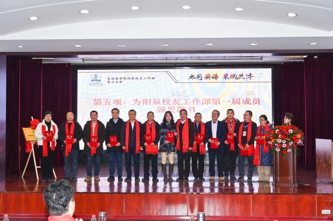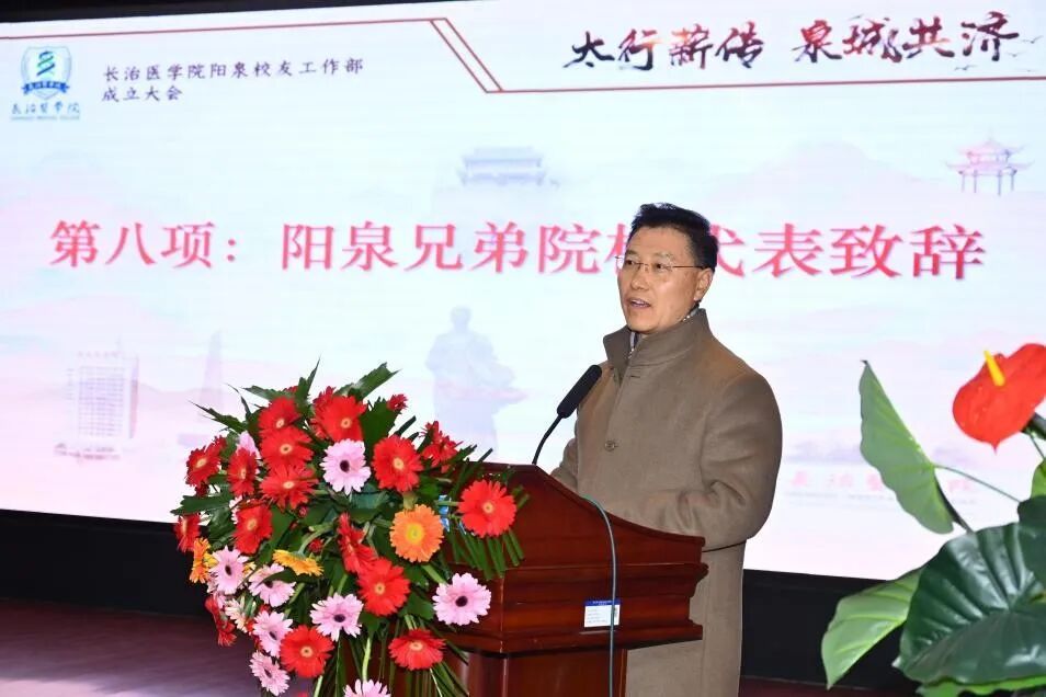 12月28日下午,长治医学院阳泉校友工作部成立大会在阳泉市第一人民医院举行。长治医学院党委副书记、校长王旭,党委(校长)办公室主任邢育宏,护理学院党委书记郭小燕、原党委书记石虹、副书记谢冰出席成立大会。阳泉市第一人民医院党委书记陈魁胜、院长马迎光,通用环球华阳山西健康产业有限公司董事长贾志文,我校95级校友、阳泉市疾病预防控制中心主任尹亮,93级校友、阳泉市妇幼保健院院长张会青,2001级校友、阳泉市中医院副院长潘盂泉,93级校友、阳泉市第四人民医院副院长杨秀慧,99级校友、阳泉市平定县人民医院副院长苗庆林,阳泉市职业技术学院副院长王海平,阳泉市职业中专学校校长杨绪仁,阳泉市师范高等专科学校特教系书记樊卫生和我校西安校友工作部名誉部长韩霜、部长田俊斌,北京校友工作部秘书长牛天亮,太原校友工作部副部长刘建云,忻州校友代表张璇、姜芳、赵镇山,朔州校友代表王成武、李继平以及阳泉校友代表共150余人参加成立大会。
