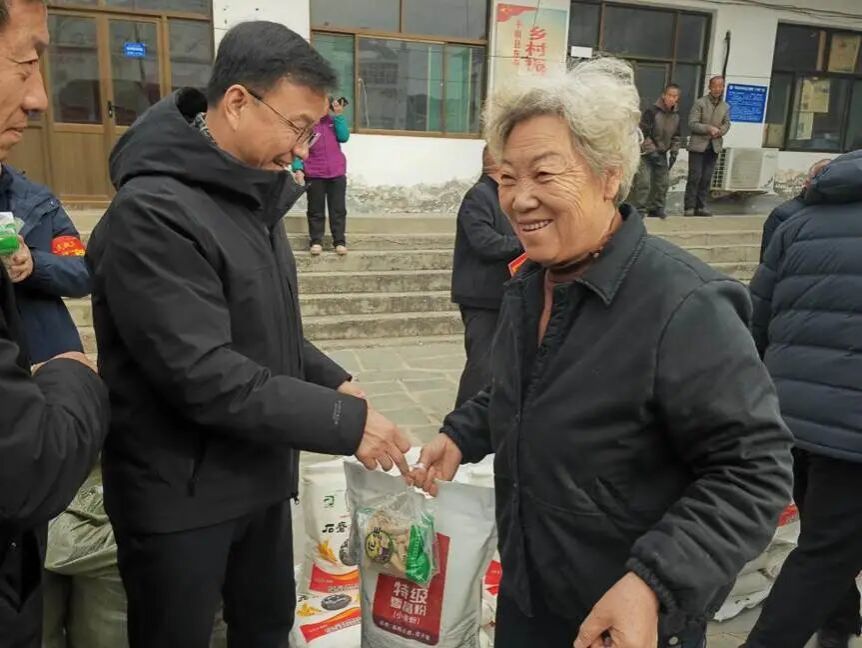 座谈结束后,校领导将精心筹备的节日物资逐一送到村民手中,一句句暖心问候、一声声真挚祝福,让冬日的乡村充满暖意。