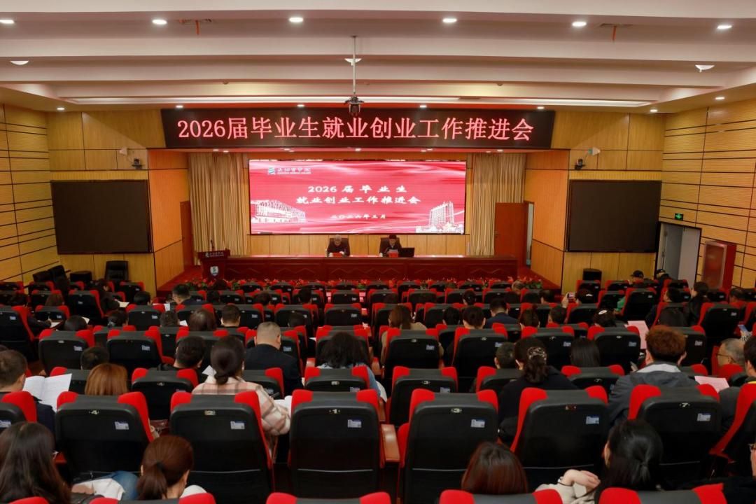 3月30日下午,我校在济世厅召开2026届毕业生就业创业工作推进会,深入分析了当前就业形势,部署了下一阶段重点工作。校党委副书记郑金平出席会议并讲话,学生工作部、教务部、校团委、研究生学院负责人,各院系党政负责人、分管学生工作副书记,全体辅导员及学生工作部全体人员参加会议。会议由学生工作部部长裴振主持。
